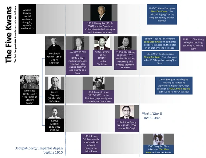 - Chung Do Kwan: Founded by Lee Won Kuk in 1944. It emphasized a combination of Shotokan karate and traditional Korean martial arts.